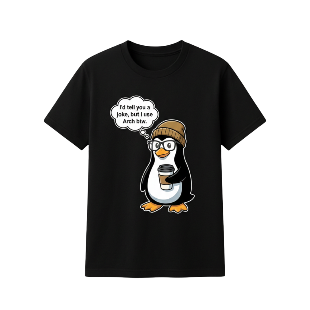 Flex your Linux superiority with this humorous “I Use Arch Btw” tee, featuring a coffee-sipping Tux in full hipster attire.